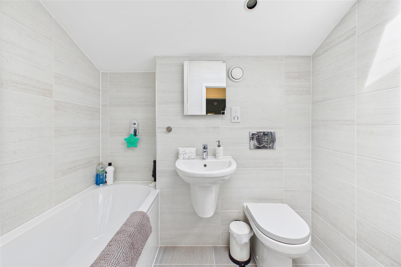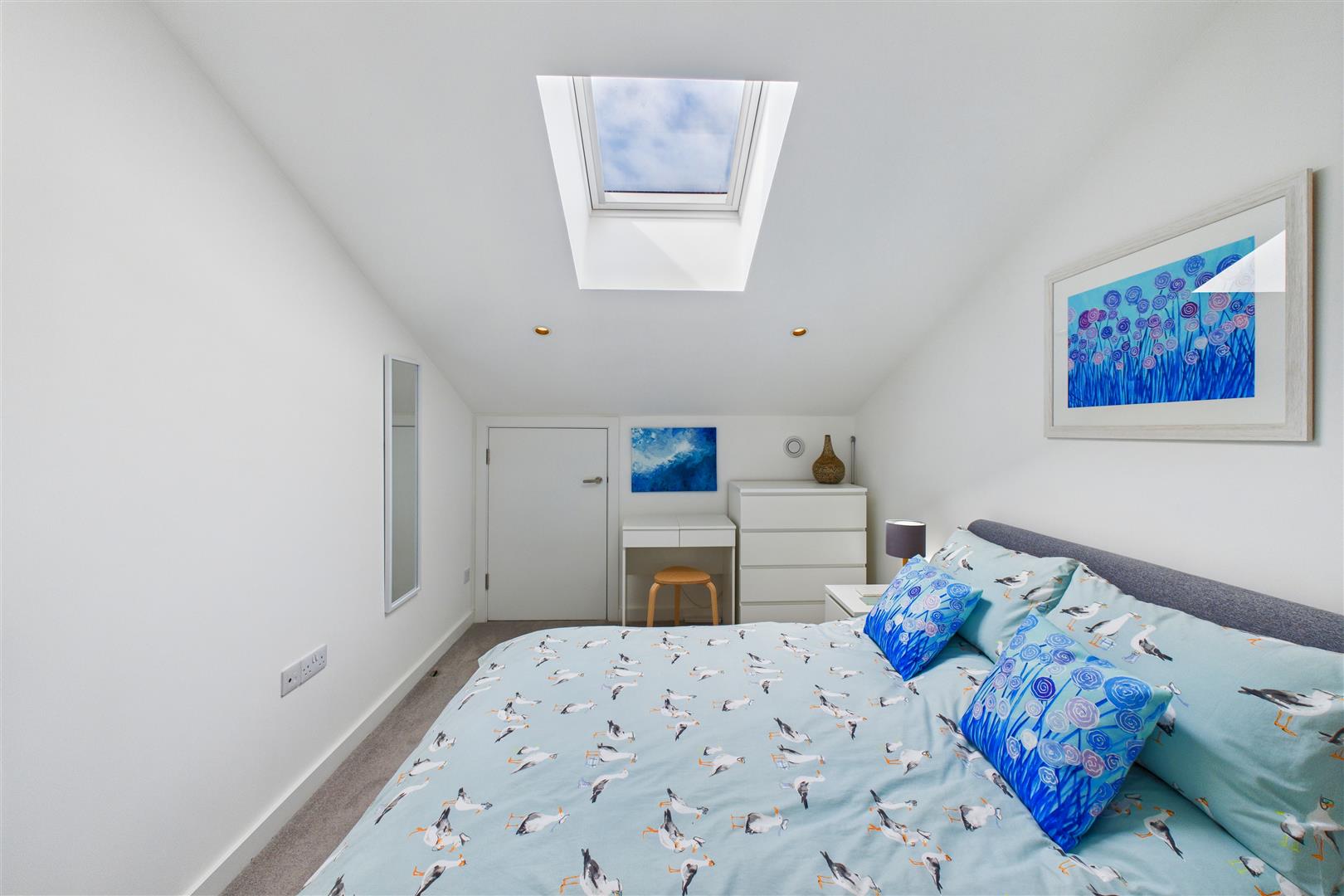 To the first floor are 2 generous vaulted double bedrooms. The front bedroom has a designated wardrobe/dressing area and is awash with light thanks to the large front aspect glazed windows. The rear bedroom is a comfortable double with ample room for wardrobes, and a large storage area under the eaves houses the heat recovery unit with lots of room to spare. The bathroom is floor to ceiling tiled with hidden cistern WC, basin and bath with a mains fed shower over. There is also handy shelving for storage.