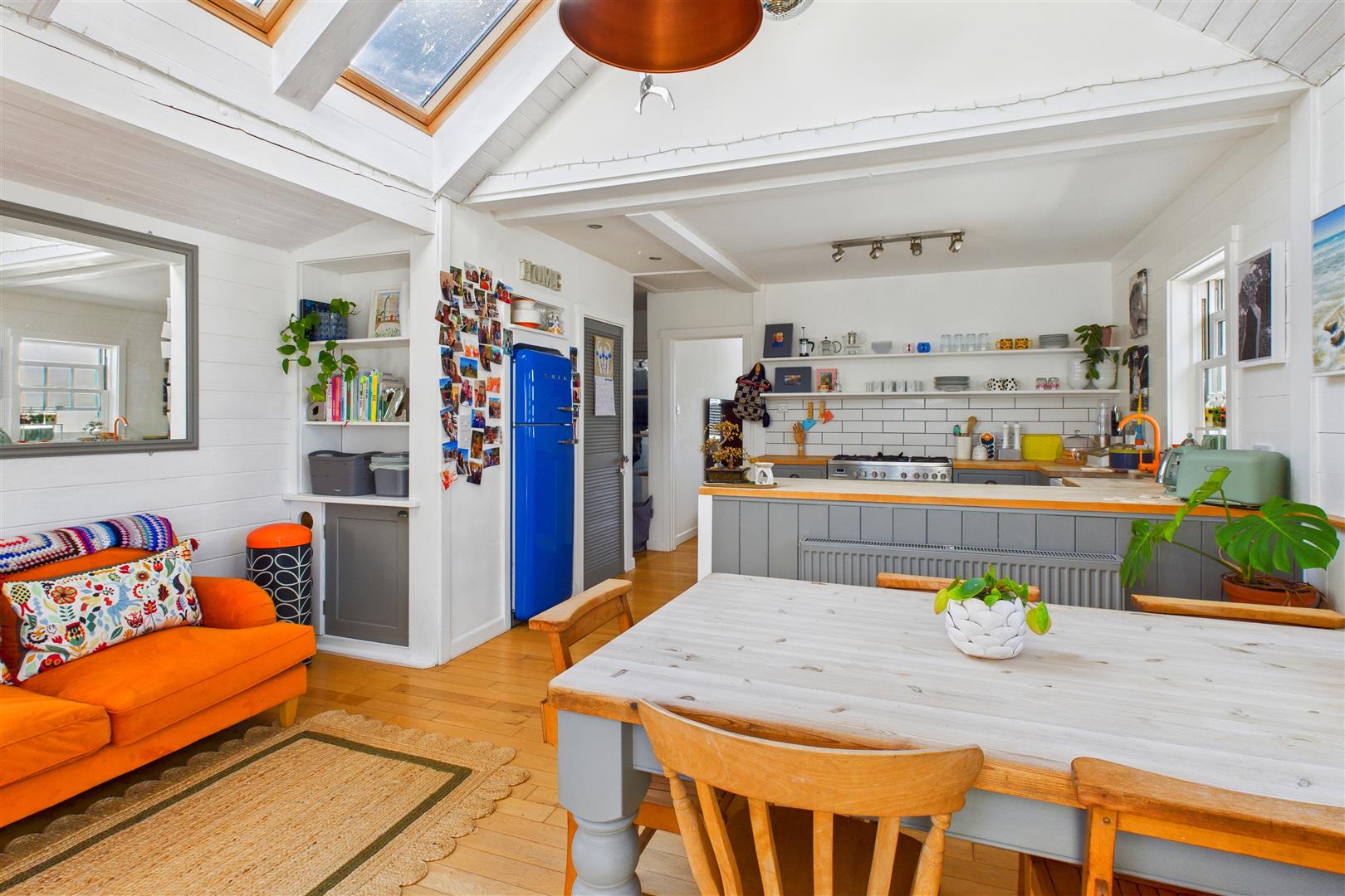The entrance hall provides a useful coat/shoe area and leads directly into the central inner hall that leads to all main rooms. The cosy lounge is to the front of the property with a feature box bay window overlooking the front garden and a woodburner. The beautiful open plan kitchen/diner to the rear has a light open feel with a part vaulted ceiling and skylights, opening up onto a rear garden dining deck with sea views. A small snug/office lies directly off the kitchen/diner. The 3 bedrooms are all on the same level, one having a small en-suite shower room and the other 2 being served by the generous and well-appointed family bathroom. The property is in excellent condition throughout.